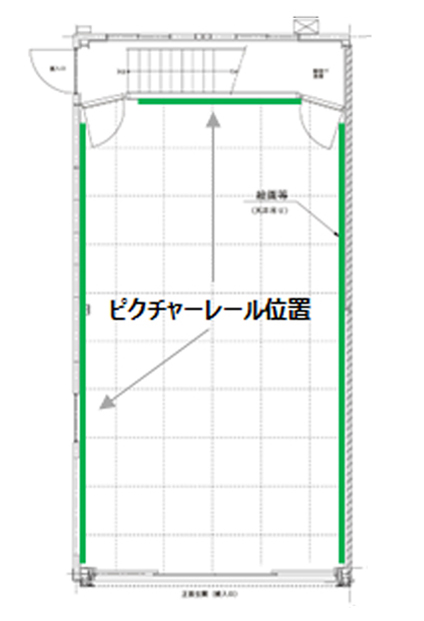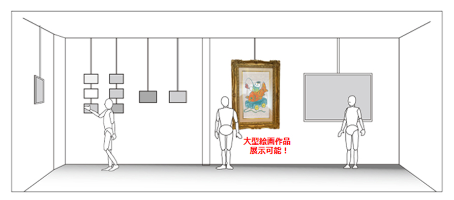 ピクチャーレールを3方天井に装備していますので大型の額装作品等の展示も可能です