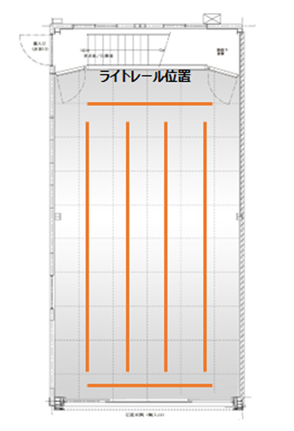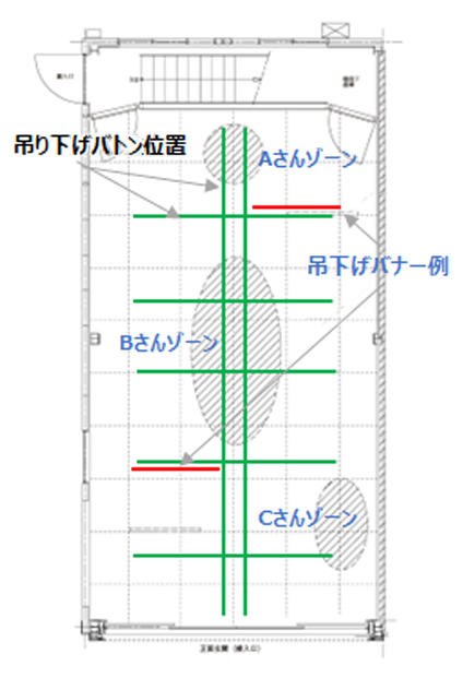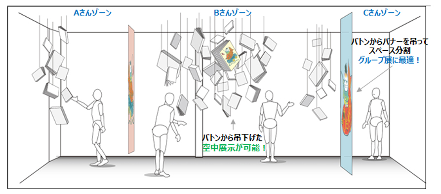 天井に装備されたバトンを利用して天井から吊下げる形で空間を活用した展示も可能です