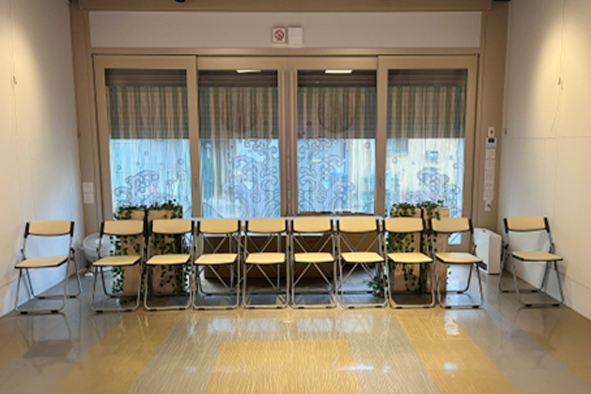 下図写真のようにパイプ椅子をマックス横10個ならべることができます