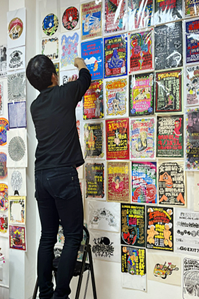 壁面は掲示板用シートが貼られているので小型作品は壁面に展示用テープなどで貼り付けて展示できます